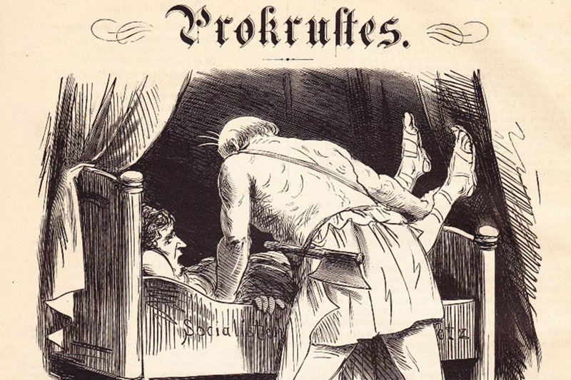 Sin embargo, en el interior de aquella posada una trampa aguardaba. Tras llenar el vientre de comida y bebida y una vez que el sueño comenzaba a hacer gala, Procusto conducía al huésped a su habitación. Le conducía a una cama mágica cuyo poder era el de cambiar de tamaño para nunca coincidir con el de la persona que fuera a utilizarla. Una vez que se tumbaba en ella, si la persona era más alta que la cama, Procusto la ataba y la mutilaba, cortando las partes que sobresalían hasta que encajara perfectamente en ella. Y si la persona era más bajita y le sobraba espacio, Procusto la estiraba violentamente dislocando sus miembros hasta que estos alcanzaran la longitud necesaria.